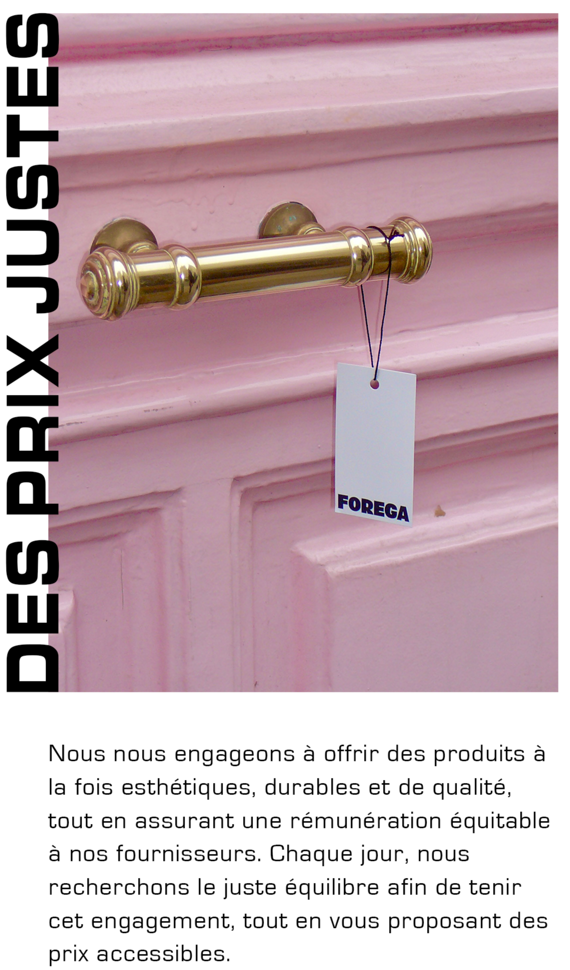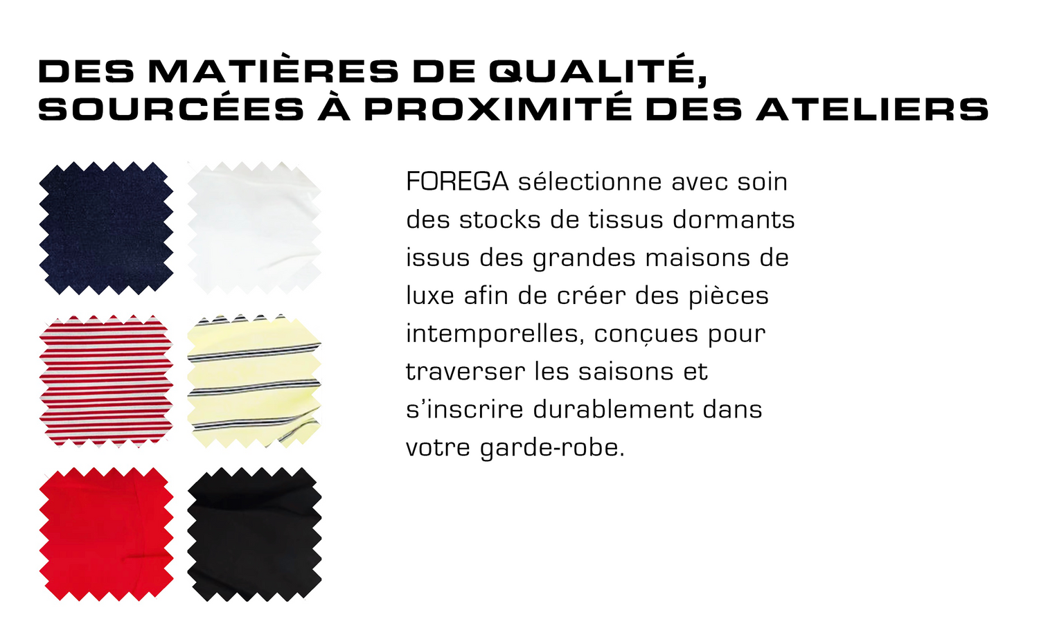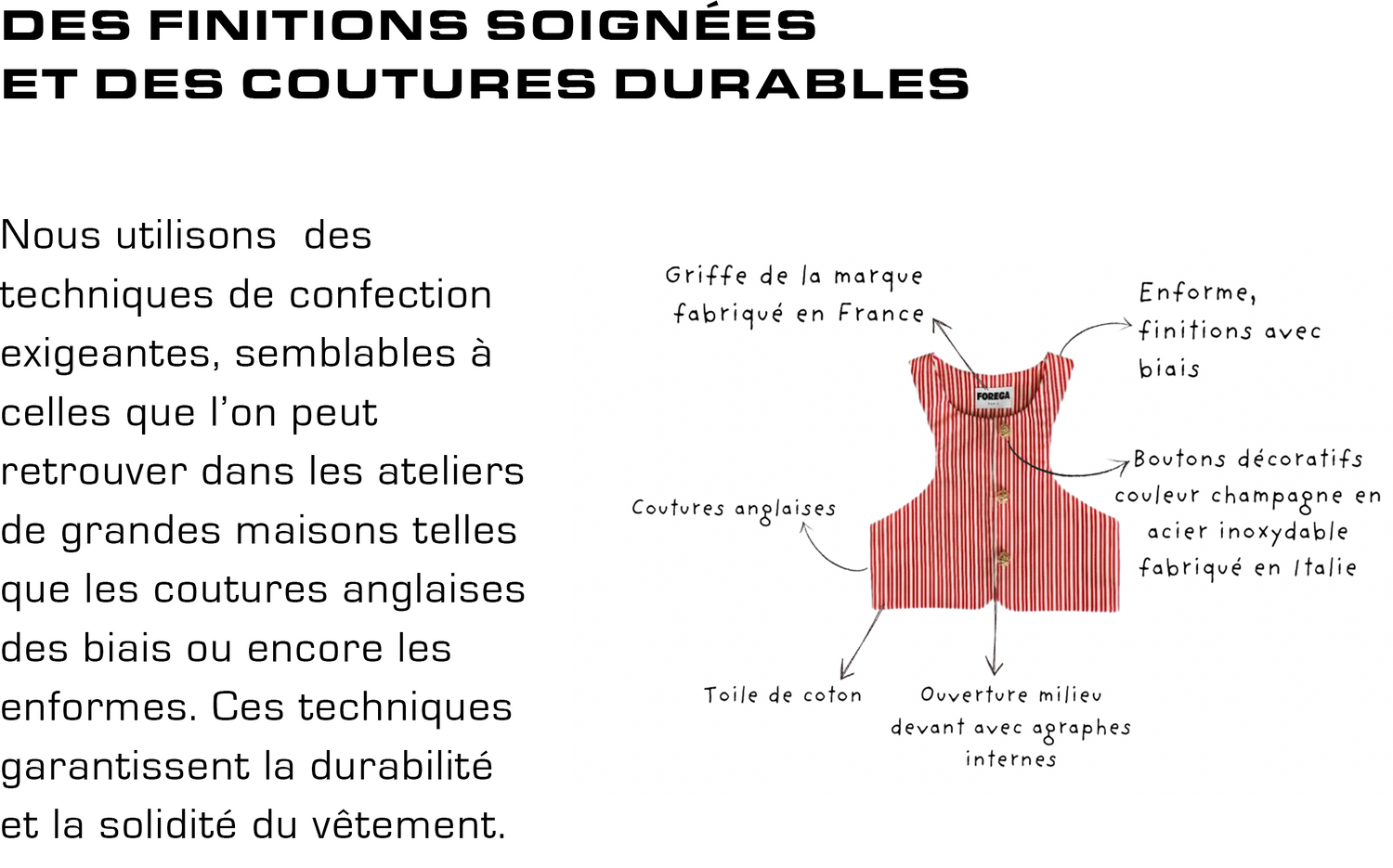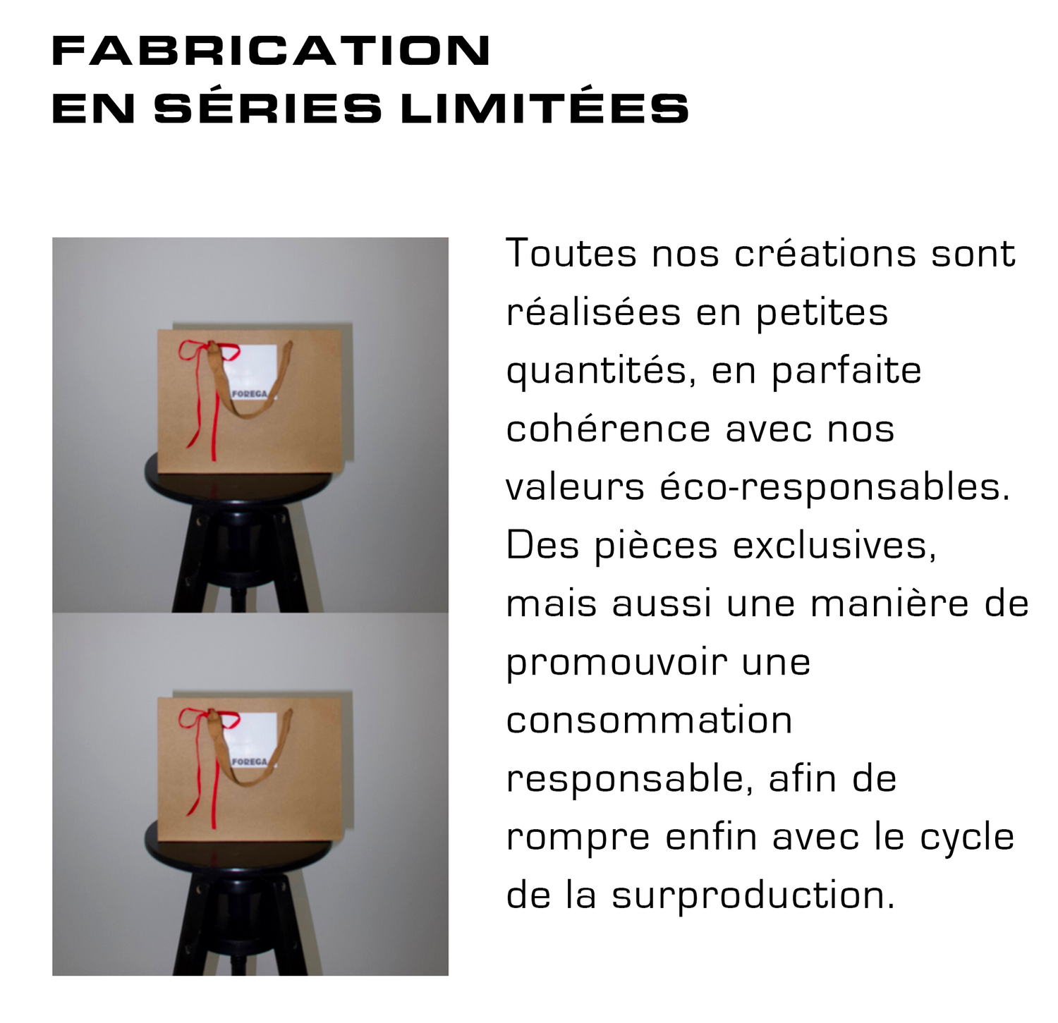 FOREGA est bien plus qu’une simple marque de vêtements : c’est un projet de coeur, né du désir de promouvoir les valeurs humaines et éco-responsables. Elle se distingue par sa transparence dans le processus de création, la production et l’honnêteté des prix. Chaque pièce, fabriquée à Paris en petites séries, met en valeur le savoir-faire artisanal français. La marque privilégie des matériaux durables et des procédés respectueux de l'environnement, tout en garantissant une rémunération équitable pour tous les acteurs qui composent la création de chaque pièce. En opposition à la fast fashion, FOREGA encourage une consommation plus consciente et durable.